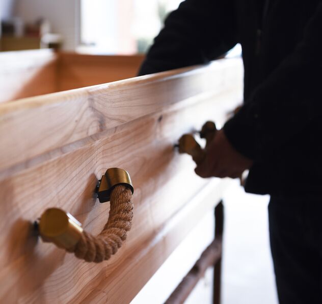 Unsere Massivholzsärge fertigen wir von Hand – aus guter Tischler-Tradition. Hierfür verwenden wir heimische Hölzer aus nachhaltiger Forstwirtschaft, denn hochwertiges Holz braucht Zeit zum Wachsen und Zeit, um schonend zu trocknen. Nur so behält es in der Verarbeitung seine Qualität.